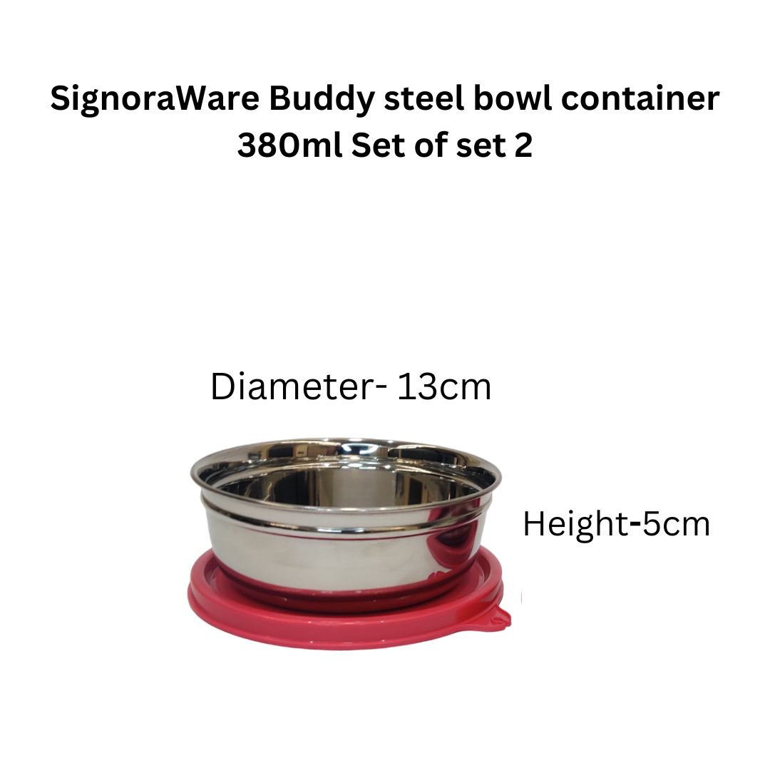 - SignoraWare Buddy Steel Bowl Container 380ml Set of 2Elevate your kitchen storage with the SignoraWare Buddy Steel Bowl Container Set. This set includes two 380ml stainless steel bowls, designed to offer both durability and elegance for all your food storage needs. Whether you’re prepping meals, storing leftovers, or organizing snacks, these versatile and stylish containers are the perfect addition to your kitchen essentials.