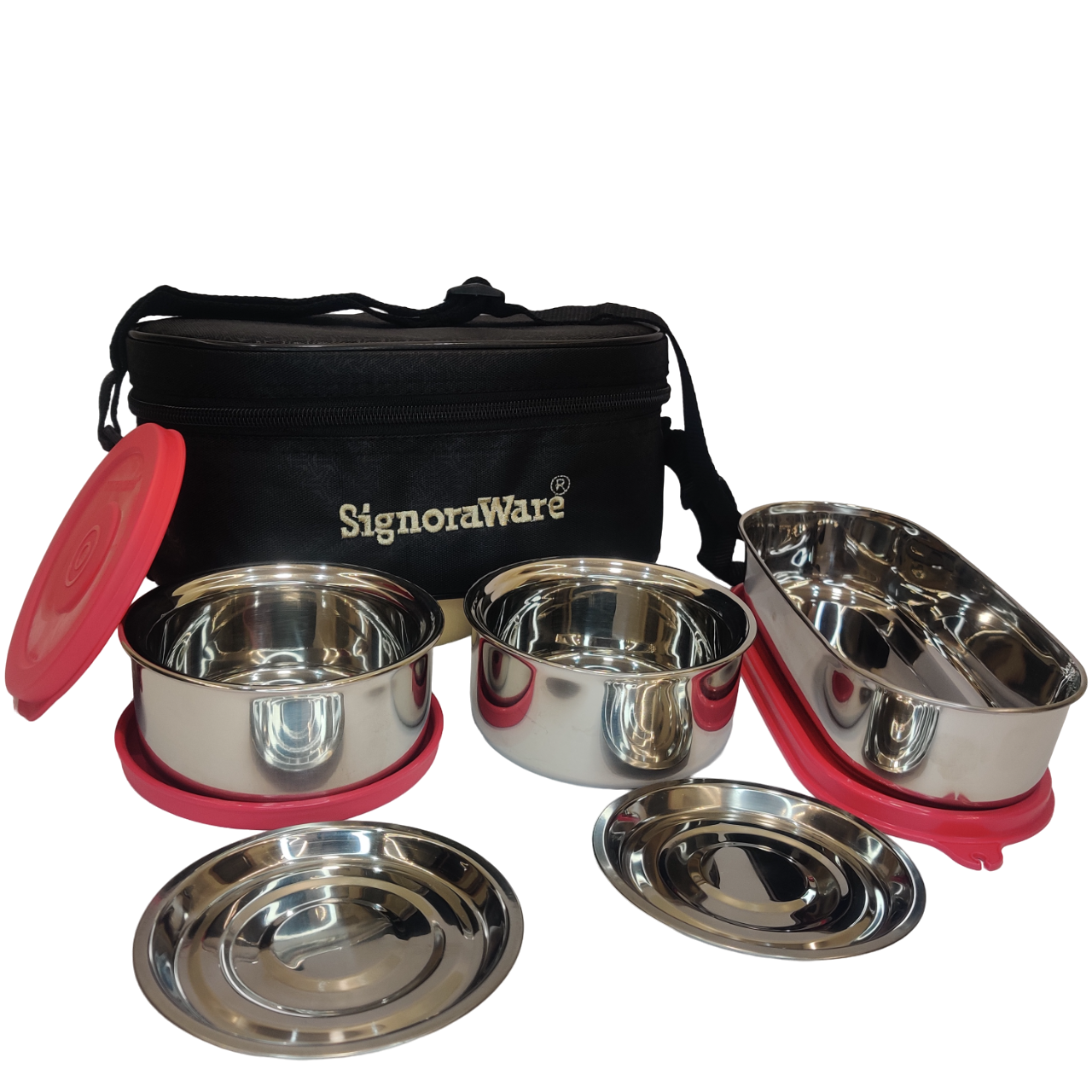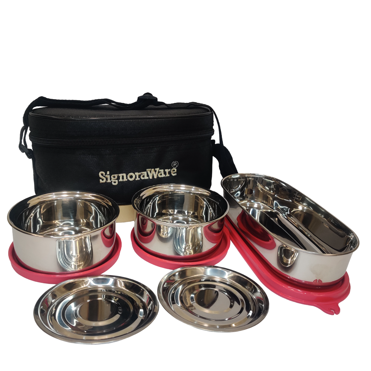 SignoraWare Double Decker Special Twin Wall Steel Lunch Box Set of 3 (260ml+260ml+650ml) with Bag