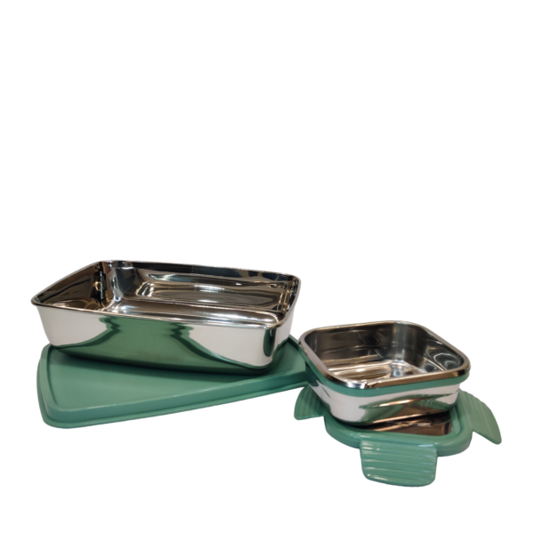 The smooth, polished finish of the stainless steel containers not only enhances their visual appeal but also makes them easy to clean and maintain. This material’s robustness ensures that the lunch box can withstand daily use while maintaining its sleek appearance.
