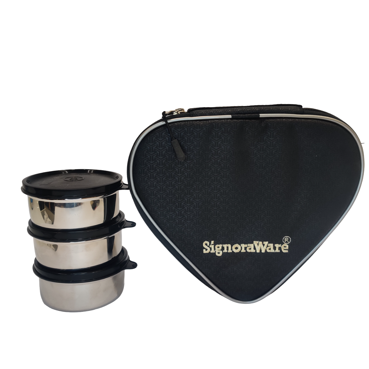 SignoraWare Sleek Steel Lunch Box Set of 3 (350ml + 350ml + 350ml) with Bag: Elegant and Practical Meal Storage